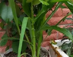 多年生高大丛生草本。秆粗壮,高2-4(-6)米,直径1-2厘米,具多数节,无毛。叶鞘长于其节间,基部或上部边缘和鞘口具柔毛;叶舌膜质,长1-2毫米,顶端截平;叶片宽大,线状披针形,长1-2米,宽2-5厘米,顶端长渐尖,基部渐变窄,中脉粗壮,无毛,上面基部生柔毛,边缘锯齿状粗糙。