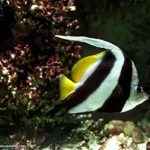 体长可达16-19厘米。头部三角形,嘴小,向前突出。眼睛位于头部的边缘,从嘴经眼到背鳍前方有1条黑带,黑带后面有1条平行的银白色宽带,鳃盖后部到腹鳍还有1条黑带。至头部以后全身为鲜黄色。背鳍从头部一直延伸到尾柄,臀鳍从腹部延伸到尾柄,两鳍上下对称。因长有长嘴巴的头部犹如狐狸,故又被称为“狐狸鱼”。