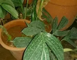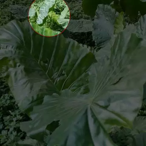 幼株叶柄苍绿色,具淡紫色斑块,长为叶片的1/3-1/4,至中部以上具鞘;叶片表面中肋白色,余为亮如丝绢的绿色;成熟植株叶柄长约为叶片的1/2,下半部具鞘;叶片宽椭圆形,短渐尖,长25-35厘米,宽10-19厘米;花枝上部的叶柄短,至中部具鞘,叶片卵形,基部近心形;I级侧脉18-20对,与中肋成70度角,斜伸,近边缘上升。
