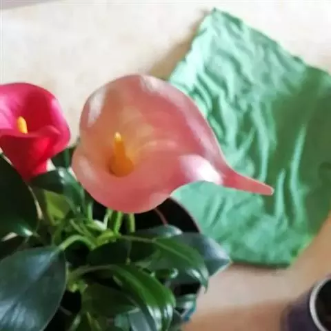 佛焰苞白色,长17厘米,下部闭合,长12厘米,宽2厘米,上部长圆状卵形,长5-6厘米,宽4厘米,短渐尖。肉穗花序无梗:雌花序长9厘米,花疏;雄花序长5厘米;中间间隔长2厘米,具少数中性花。子房扁球形,1-2室,柱头圆形或2裂,假雄蕊棒状,长5毫米。