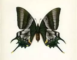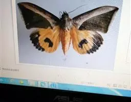 翅展66-100mm。头、胸、腹橙色,头顶中央有1个小黑斑,额、下唇须及触角黑色,颈板橙色,中间有1个闪光大黑斑,翅基片闪光黑色,胸部有闪光黑色纵斑,腹部背面具黑色横带,第1节的黑斑成三角形,末2节的成方形,侧面及腹面各具1列黑斑;前翅闪光黑色,前缘区从基部至外线处有4个黄白斑。1脉上方有6个大小不等的黄白斑,中室末有1个橙色斑点,中室外至2脉末端上方有3个斜置的黄白色大斑;后翅橙色,中室中部下方至后缘有1条黑带,横脉纹为大黑斑,其下方有2个黑斑位于2脉及1脉上,外缘翅顶至2脉处黑色,其内缘成齿状,在亚中褶外缘处有1个黑斑。