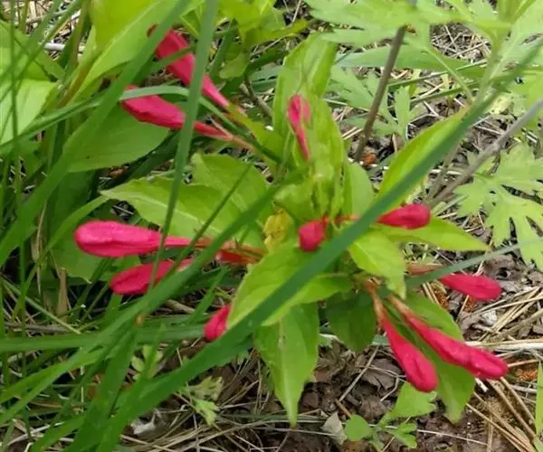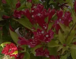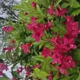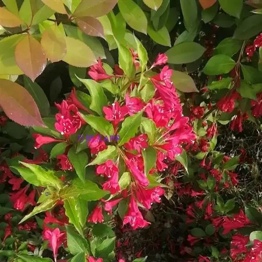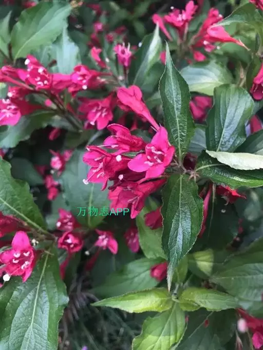 8.红王子锦带花:其植株较矮,株高1米至2米,冠幅1.4 m。嫩枝淡红色,老枝灰褐色。叶长椭圆形,整个生长季叶片为金黄色。夏初开花,花期自4月陆续开到10月 份,枝条开展成拱形。聚伞花序生于叶腋或枝顶,花冠漏斗状钟形,花朵密集,花冠胭脂红色,艳丽悦目。