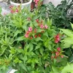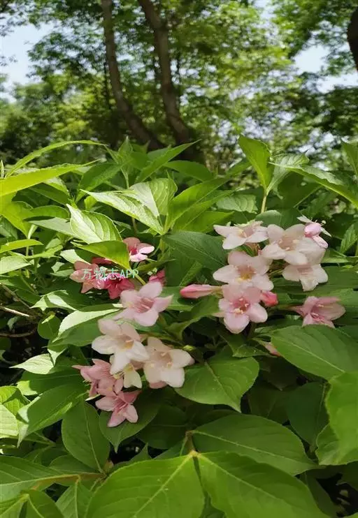 4.花叶锦带花:株高2米至3米。株丛紧密,株高1.5-2m,冠同2-2.5m,叶缘乳黄色或白色,叶对生,长卵形,叶端渐尖。聚伞花序生于枝顶,萼筒绿色,花冠喇叭状,花色由白逐渐变为粉红色,由于花开放时间不同,有白、有红,使整个植株呈现 两色花,在花叶衬托下,格外绚丽多彩。
