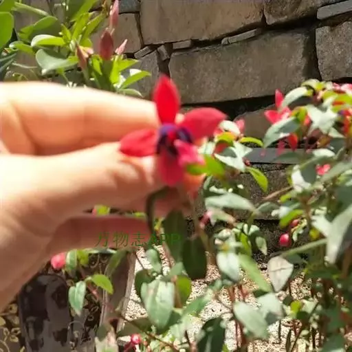 花两性,单一,稀成对生于茎枝顶叶腋,下垂;花梗纤细,淡绿色或带红色,长3-7厘米;花管红色,筒状,上部较大,长1-2厘米,径3-5毫米,连同花梗疏被短柔毛与腺毛;萼片4,红色,长圆状或三角状披针形,长2-3厘米,宽4-8毫米,先端渐狭,开放时反折;花瓣色多变,紫红色,红色、粉红、白色,排成覆瓦状,宽倒卵形,长1-2.2厘米,先端微凹;雄蕊8,外轮的较长,花丝红色,伸出花管外的长1.8-3厘米,花药紫红色,长圆形,长2-3毫米,径约1毫米,花粉粉红色;子房倒卵状长圆形,长5-6毫米,径3-4毫米,疏被柔毛与腺毛,4室,每室有多数胚珠;花柱红色,长4-5厘米,基部围以绿色的浅杯状花盘;柱头棍棒状,褐色,长约3毫米,径约1.5毫米,顶端4浅裂。果紫红色,倒卵状长圆形,长约1厘米。花期4-12月。