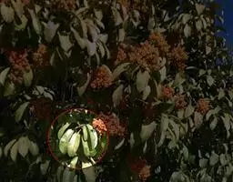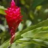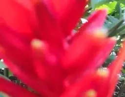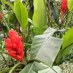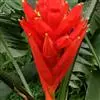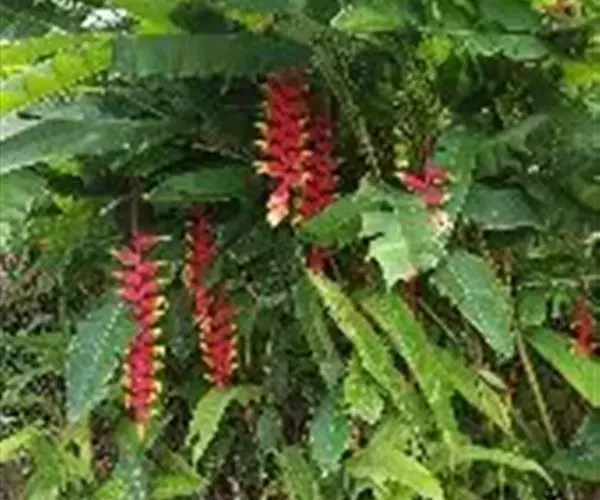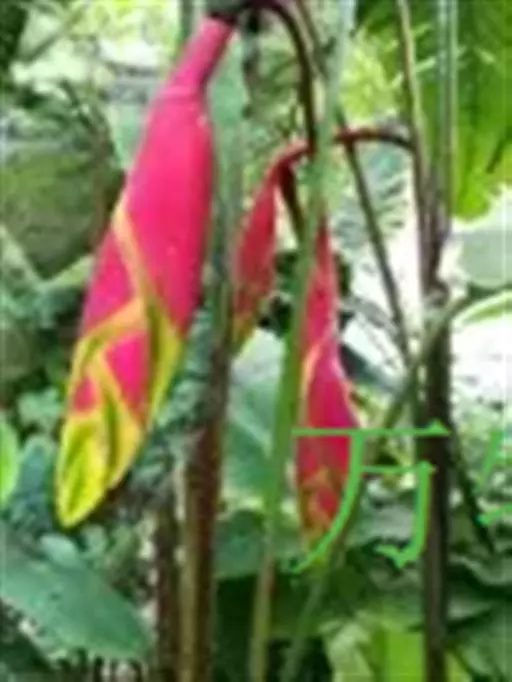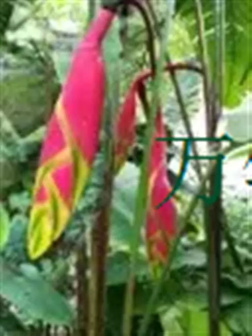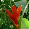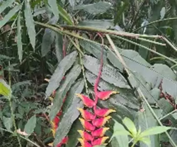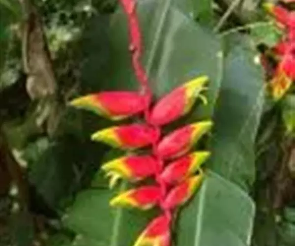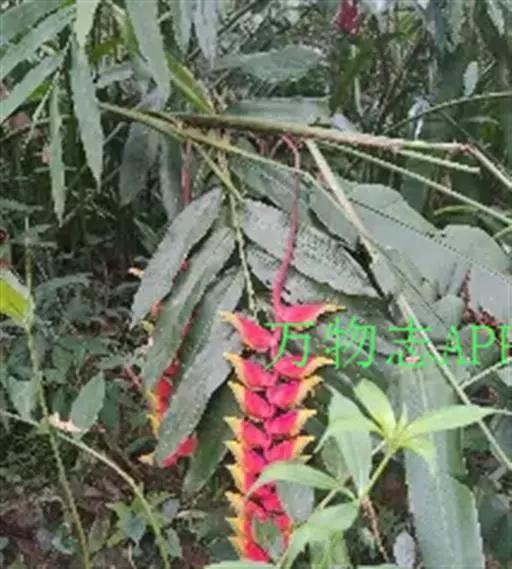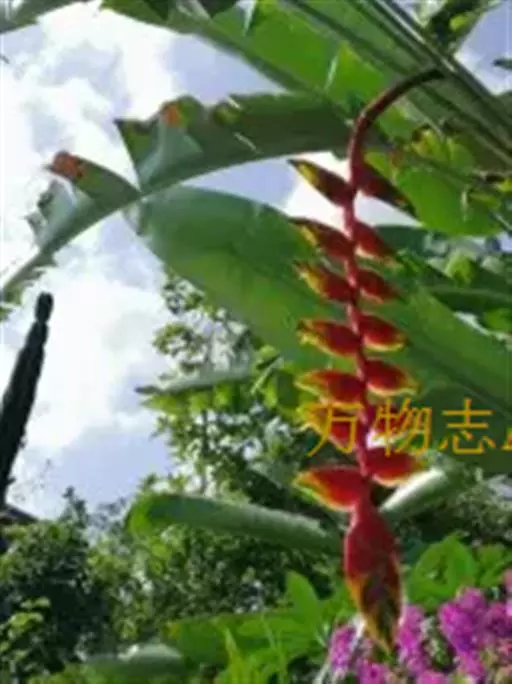 金嘴蝎尾蕉(Heliconia rostrata Ruiz & Pavon):芭蕉科,蝎尾蕉属多年生草本植物。株高可达6米。叶片长圆形,叶面绿色,叶背亮紫色;顶生花序,直立,薄被短柔毛;苞片绿色,开放时突露,花被片红色,顶端绿色,狭圆柱形,果三棱形,灰蓝色,有种子不多于3颗。5-10月开花。