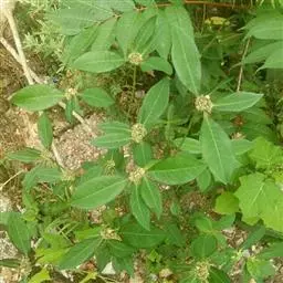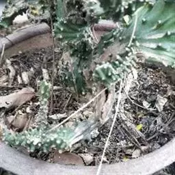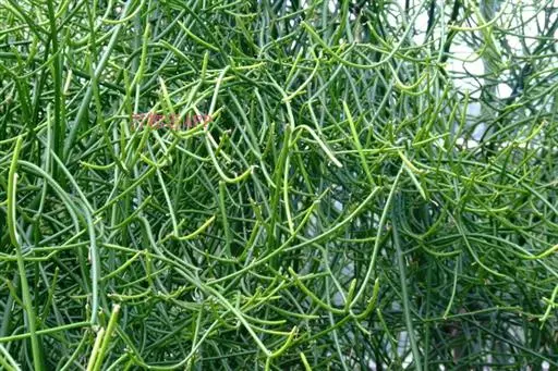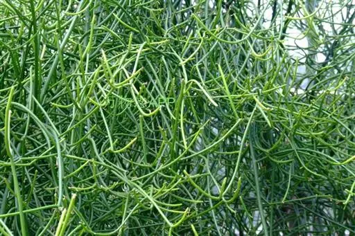 灌木或小乔木,萃直立,高可达2~5m,全株有白色乳汁(白色液体有毒);小枝对生或近轮生,绿色,稍肉质。叶退化成鳞片状,或少数散生枝端。杯状聚伞花序,顶生或腋生,总苞片陀螺状一直径约2mm,有5个腺体,雄花少数,雌花淡黄色,花柱下部合生,柱头头状,先端短2裂。子房3室。蒴果暗黑色,被贴伏的柔毛;种子卵形。