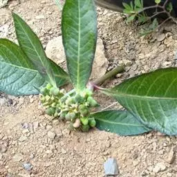 总苞陀螺状,高约2毫米,直径约1.5毫米,内侧被短柔毛;腺体5枚,盾状卵形或近圆形。雄花数枚,伸出总苞之外;雌花1枚,子房柄伸出总苞边缘;子房光滑无毛;花柱3,中部以下合生;柱头2裂。蒴果棱状三角形,长度与直径均约8毫米,平滑,略被毛或无毛。种子卵球状,长与直径均约4毫米,平滑;具微小的种阜。花果期7~10月。白色乳汁有剧毒,需特别谨慎以免中毒。