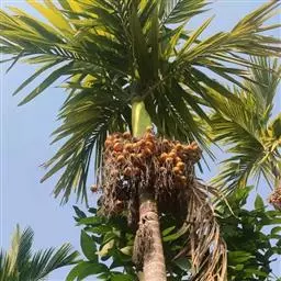 槟榔(学名:Areca catechu L.),是单子叶植物纲、初生目、棕榈科、槟榔属常绿乔木,茎直立,乔木状,高10多米,最高可达30米,有明显的环状叶痕,雌雄同株,花序多分枝,子房长圆形,果实长圆形或卵球形,种子卵形,花果期3-4月。