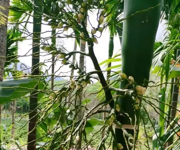 热带雨林温室的槟榔树 种子处理:由于槟榔种子有1个后熟期,采收后应将槟榔种子摊晒5-7天,果皮略干,使其完全成熟后再进行催芽。用编织袋将晒好的槟榔种子装入编织袋中,放在阴凉处,每天早上或晚上浇水1次,连续15-20天,待果皮松软,用清水冲洗干净后接着催芽。
