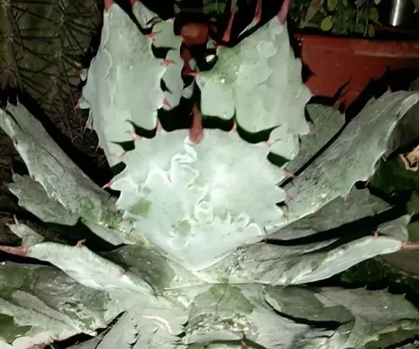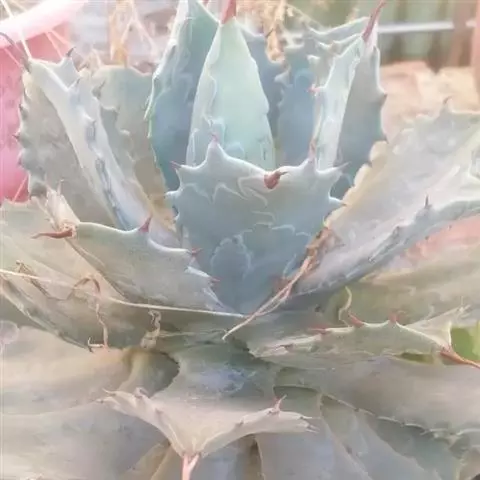 雷神为多年生肉质植物。植株高度20厘米,呈莲座状簇生。叶片长25厘米,青绿色披白粉。叶片根部狭窄肥厚,先端尖锐,且长有锈红色尖刺。叶片边缘分布多对波浪状短刺,整体呈倒卯状。夏季开花,黄绿色,呈漏斗状 。