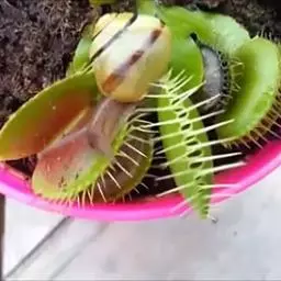 捕蝇草有时会误捉到枯枝、落叶,如果少了这项确认机制,必然会将养分浪费在消化无法消化掉的杂物上。若捕虫器误捉到杂物,只要没有持续的刺激,在数小时之后便会重新打开捕虫器,等待下一个猎物。 捕蝇草 当捕获到昆虫被两瓣叶片给夹住后而无法挣脱,昆虫在挣扎的过程中叶片会越夹越紧直到几乎密闭的状态,这时两片叶瓣内侧密集的内腺体会分泌出消化液,利用这些消化液中含有的蛋白酶,将昆虫的蛋白质分解成以氮、氧、碳、氢为主,还可能包括其他元素构成的氨基酸并进行吸收。一般大约四天左右能分解完成并吸收较易消化的部份,之后再继续吸收剩余的氮、磷以及其它各种所需的微量元素。这些养份都吸收完毕之后,叶瓣就会再度打开,全部时间大约需花5~10天的程度,这时昆虫只剩下由几丁质组成的空壳残骸。