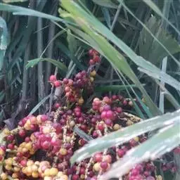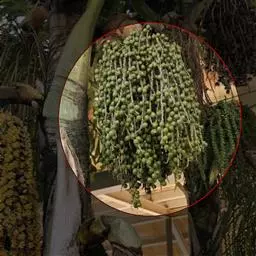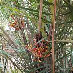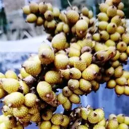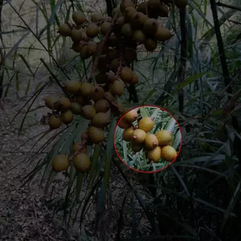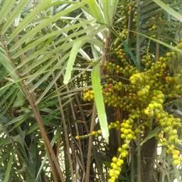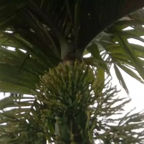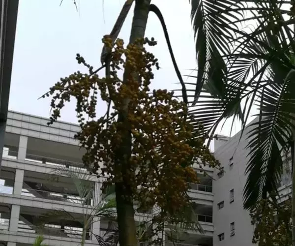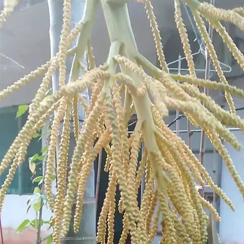 花序生于叶鞘之下,呈圆锥花序式,长约0.8米,具2-3次分枝,分枝花序长20-30厘米,其上有8-10个小穗轴,长12-18厘米;花小,卵球形,金黄色,螺旋状着生于小穗轴上;雄花萼片和花瓣各3片,上面具条纹脉,雄蕊6,花药多少丁字着;雌花萼片和花瓣与雄花的略同,子房1室,具短的花柱和粗的柱头。