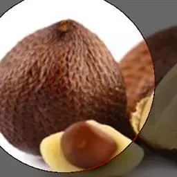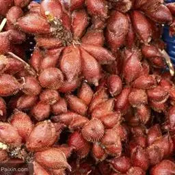 果实略为陀螺形或倒卵形,长约1.5-1.8厘米,直径0.8-1厘米,鲜时土黄色,干时紫黑色,外果皮光滑,中果皮具网状纤维。种子略为倒卵形,胚乳均匀,中央有狭长的空腔,胚侧生。花期5月,果期8月。