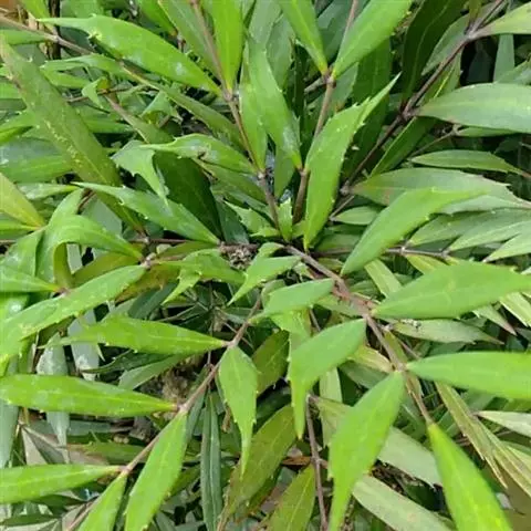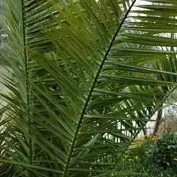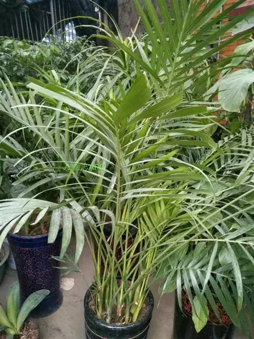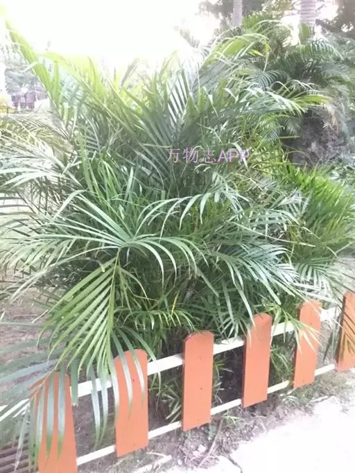 散尾葵为丛生灌木,高2-5米,茎粗4-5厘米,基部略膨大。叶羽状全裂,平展而稍下弯,长约1.5米,羽片40-60对,2列,黄绿色,表面有蜡质白粉,披针形,长35-50厘米,宽1.2-2厘米,先端长尾状渐尖并具不等长的短2裂,顶端的羽片渐短,长约10厘米;叶柄及叶轴光滑,黄绿色,上面具沟槽,背面凸圆;叶鞘长而略膨大,通常黄绿色,初时被蜡质白粉,有纵向沟纹。