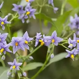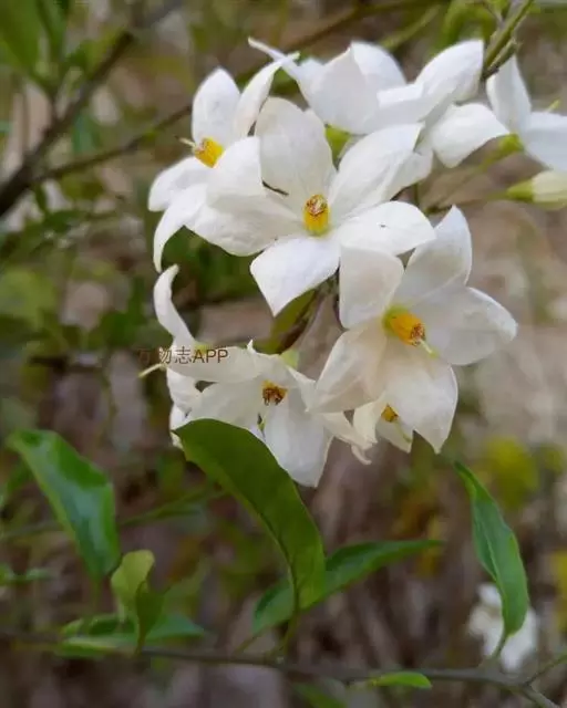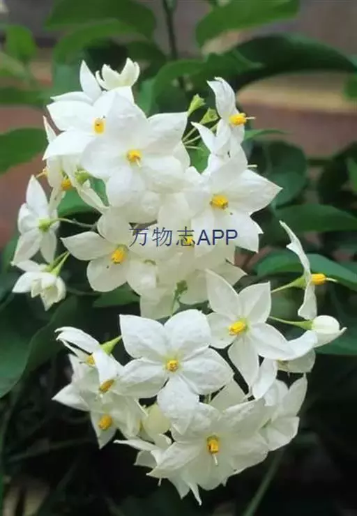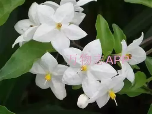 素馨叶白英(学名Solanum jasmioides Paxt.),是双子叶植物纲、茄科、茄属的一种缠绕灌木,多分枝,光滑无毛,茎具纵向细条纹。聚伞式圆锥花序顶生或侧生;花白带蓝色;萼星形,萼齿长圆形;花冠辐形,具皱折;雄蕊着生于花冠筒喉部,花药黄色,子房长圆形。原产于巴西,中国浙江农学院曾引种栽培。它可用作藤蔓花卉。