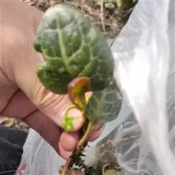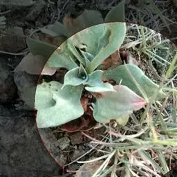 叶3-7,基生,薄革质,稍有光泽,近圆形或圆卵形或卵状椭圆形,长3.5-6厘米,宽2.5-5.5厘米,先端圆钝,基部近圆形或圆楔形,边缘近全缘或有不明显的浅齿,两面有时带紫色,脉稍隆起;叶柄长5.5-7厘米,较叶片长达1倍,稀近等长,有时带紫色。花葶常带紫色,有2(-3)枚褐色的鳞片状叶,较大,狭长圆形或长圆状卵形,长12-15毫米,宽3-5毫米,先端急尖或短尖头。