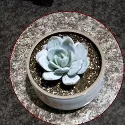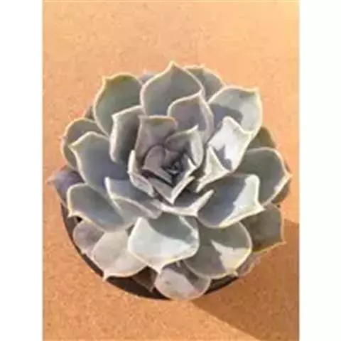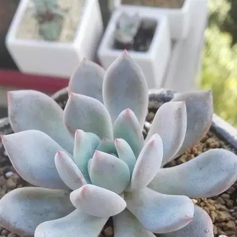 立田锦多肉(Echeveria Pachyveria ‘Albocarinata’),易群生的景天科拟石莲花属和厚叶草属杂交多肉品种。茎直立,株高30厘米以内,其叶排列呈莲座状,叶片直立,被白霜,肉质,披针形,长匙形,先端近无尖或具不明显的短叶尖,叶片中绿色,被白粉后外观呈近白色,在较低的温度下叶缘呈粉红色。