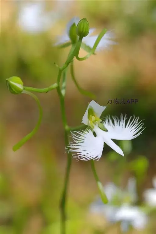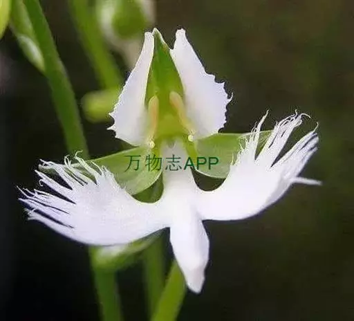 植株高35-87厘米。块茎肉质,长圆状卵形至长圆形,长2-5厘米,直径1-3厘米。茎粗壮,直立,圆柱形,具3-5枚疏生的叶,叶之上具数枚苞片状小叶。叶片长圆形至长椭圆形,长5-15厘米,宽1.5-4厘米,先端急尖或渐尖,基部抱茎,干时边缘常具狭的白色镶边。总状花序常具多朵花,长5-12厘米,花序轴无毛;花苞片披针形,长2-3厘米,先端渐尖,下部的与子房等长;子房圆柱形,扭转,无毛,连花梗长2-3厘米,先端渐狭,具喙;花白色,较大,萼片和花瓣边缘具缘毛;中萼片宽卵形,直立,凹陷,长10-13毫米,宽7-8毫米,先端急尖,具5脉,与花瓣靠合呈兜状;侧萼片张开或反折,斜卵形,长14-16毫米,先端急尖,具5脉;花瓣直立,镰状披针形,不裂,长8-9毫米,宽2-2.5毫米,先端稍钝,具2脉;唇瓣宽倒卵形,长l5-18毫米,宽12-16毫米,3裂;侧裂片近菱形或近半圆形,宽7-8毫米,前部边缘具锯齿;中裂片线状披针形或舌状披针形,长5-7毫米,宽1.5-3毫米,先端钝,具3脉;距细圆筒状棒形,下垂,长达4厘米,中部稍向前弯曲,向末端逐渐膨大,末端钝,较子房长,中部以下绿色;距口周围具明显隆起的凸出物;柱头2个,隆起呈长圆形,向前伸展,并行。花期8-10月。