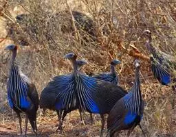 鹫珠鸡:是珠鸡科中体形最大的一种,因头颈部像兀鹫而得名。雌雄羽色相似,为黑色基底上遍布白色点斑,…