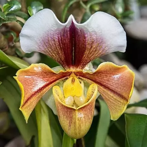 兜兰花比较雅致,色彩比较庄重,色及带有不规则斑点或条纹。花瓣较厚,花朵开放期比较长。属观赏类花草。