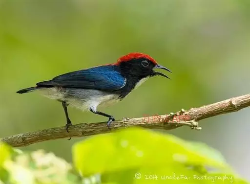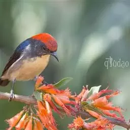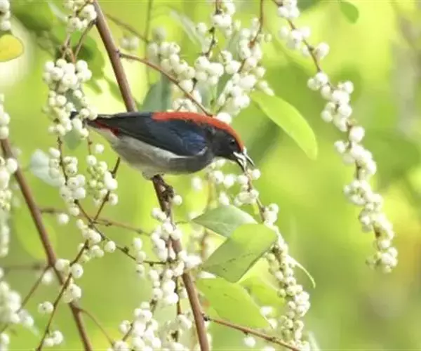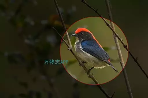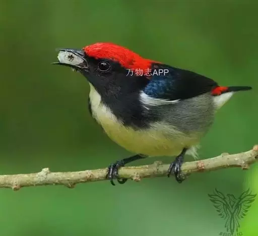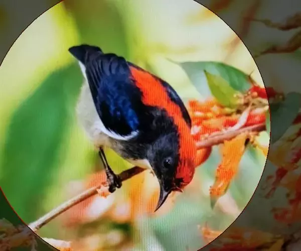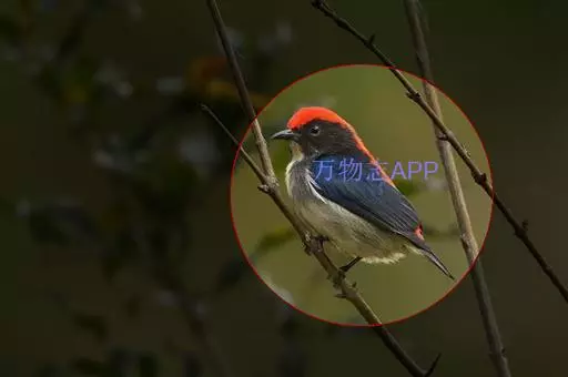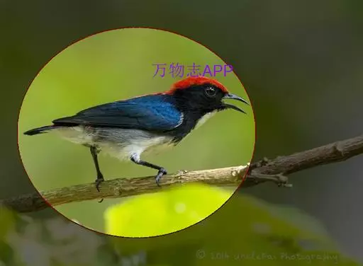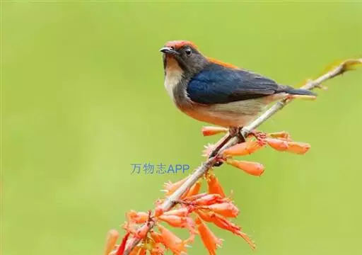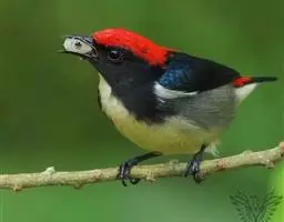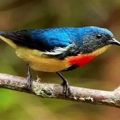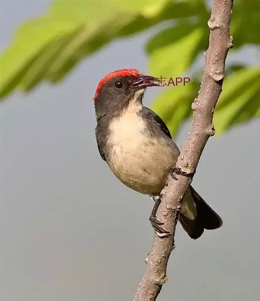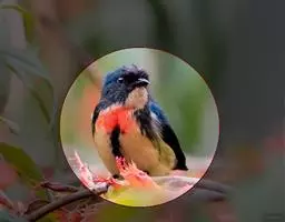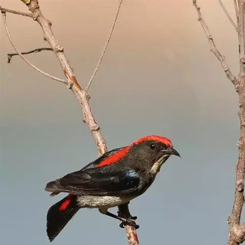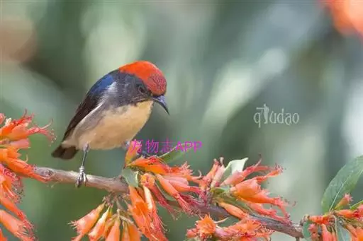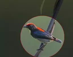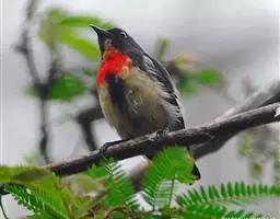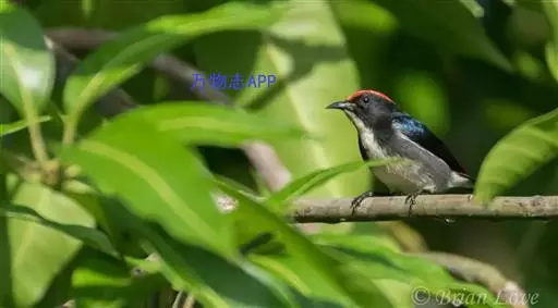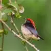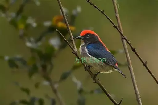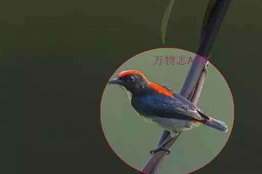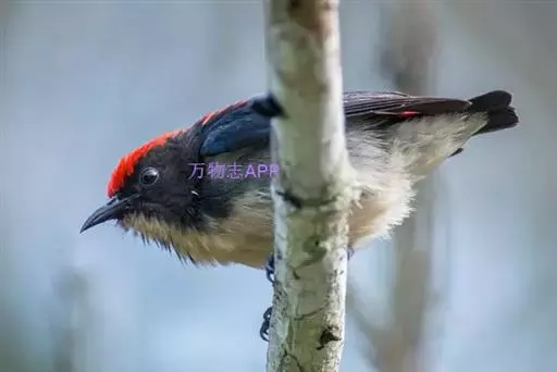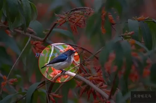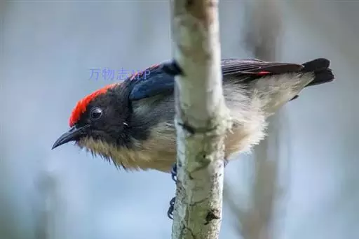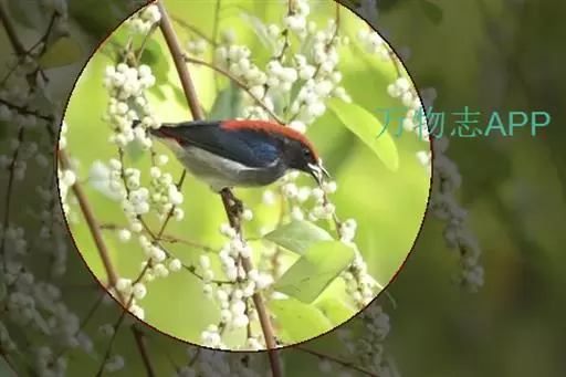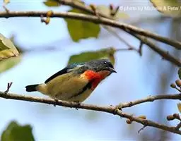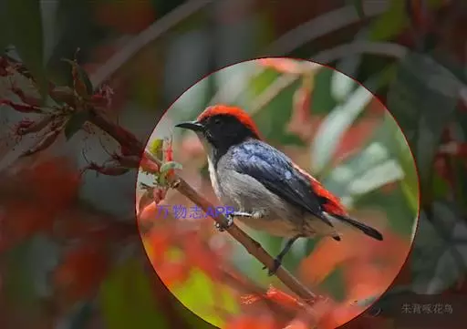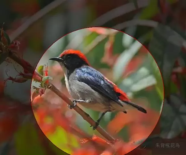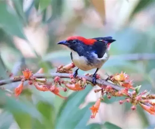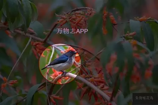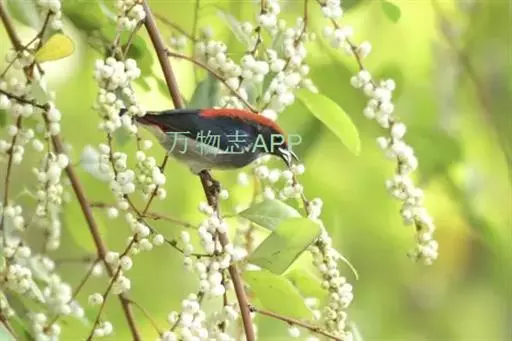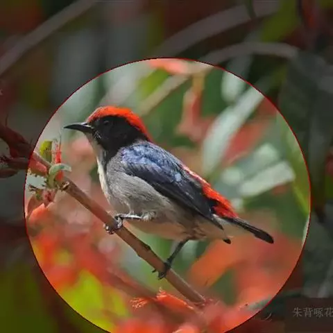 朱背啄花鸟(学名:Dicaeum cruentatum):体重6-8克,体长81-97毫米。是一种小型的黑色及红色啄花鸟。雄鸟顶冠、背及腰猩红色,两翼、头侧及尾黑,两胁灰,下体余部白色。雌鸟上体橄榄色,腰及尾上覆羽猩红,尾黑。亚成鸟清灰色,嘴橘黄,腰略沾暗橘黄色。虹膜褐色,嘴黑绿,脚黑绿。