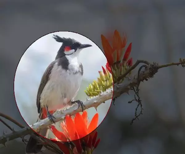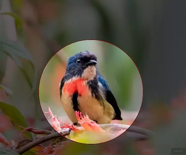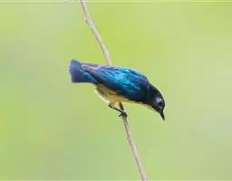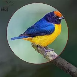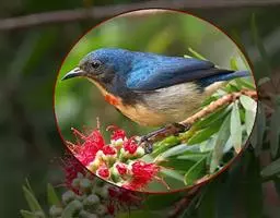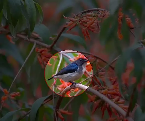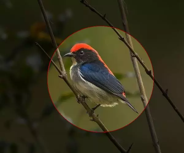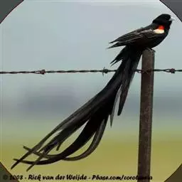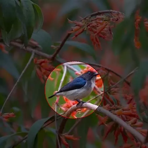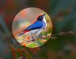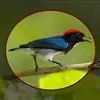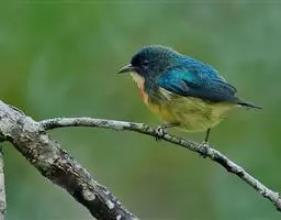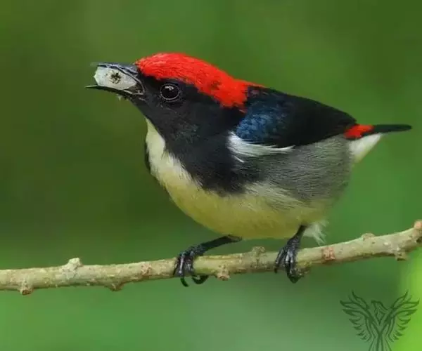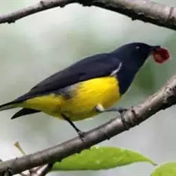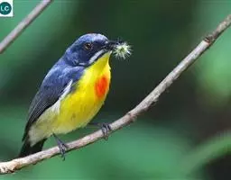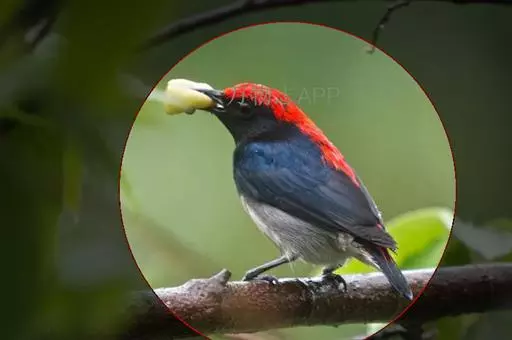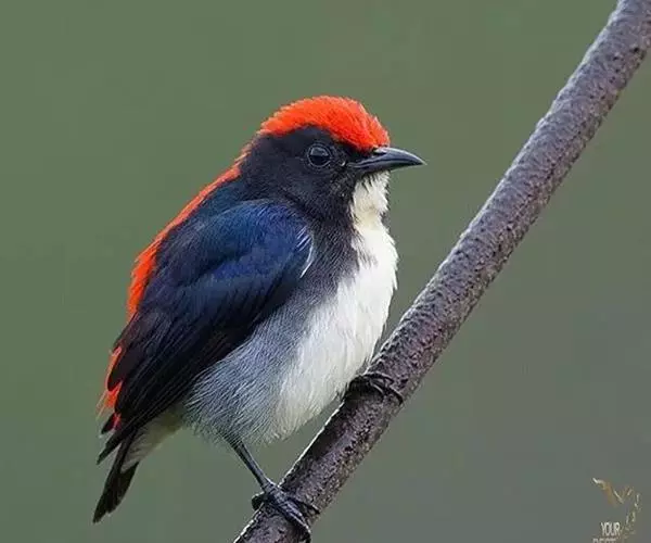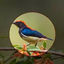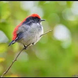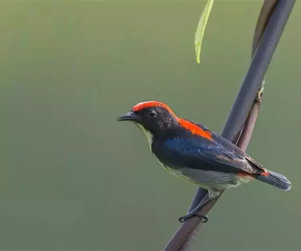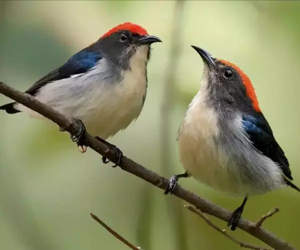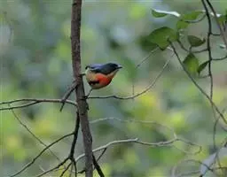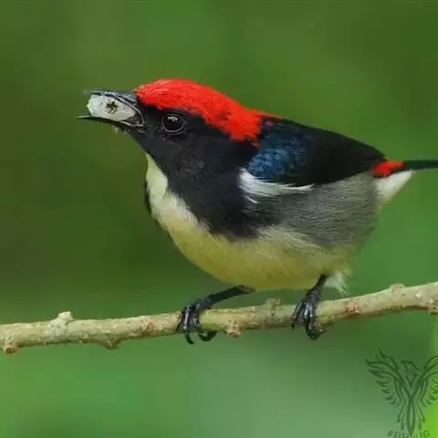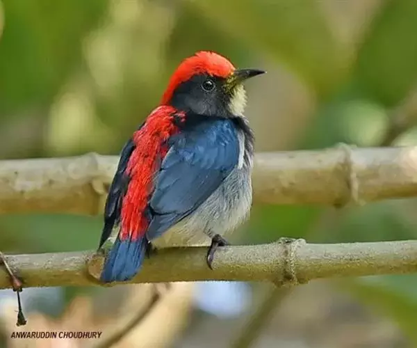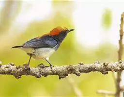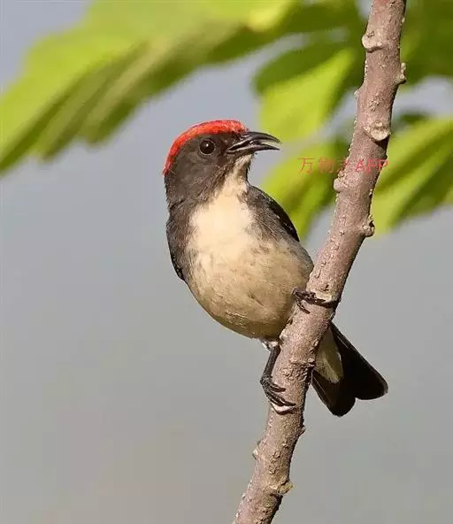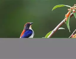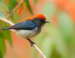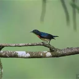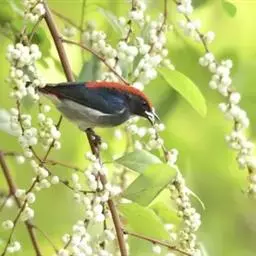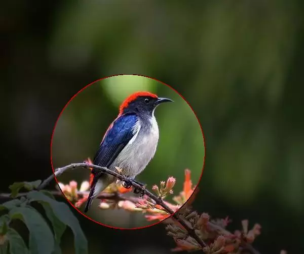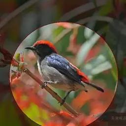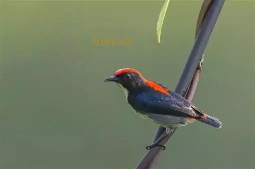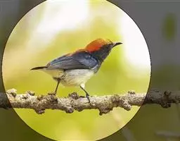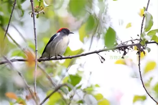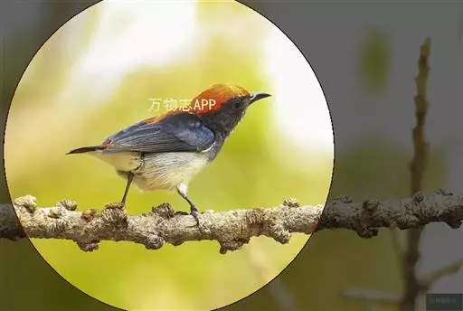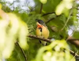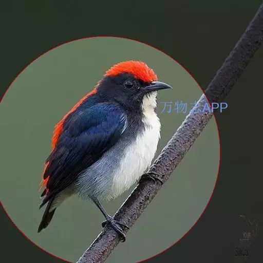 朱背啄花鸟(学名:Dicaeum cruentatum):体重6-8克,体长81-97毫米。是一种小型的黑色及红色啄花鸟。雄鸟顶冠、背及腰猩红色,两翼、头侧及尾黑,两胁灰,下体余部白色。雌鸟上体橄榄色,腰及尾上覆羽猩红,尾黑。亚成鸟清灰色,嘴橘黄,腰略沾暗橘黄色。虹膜褐色,嘴黑绿,脚黑绿。