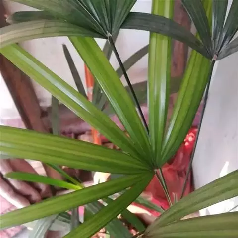 细叶棕竹,灌木,茎细如竹,多数聚生,有网状叶鞘。叶半圆形,掌状深裂,裂片狭长,阔线形,软垂,裂片7…