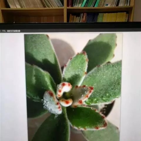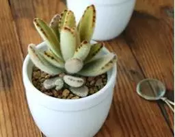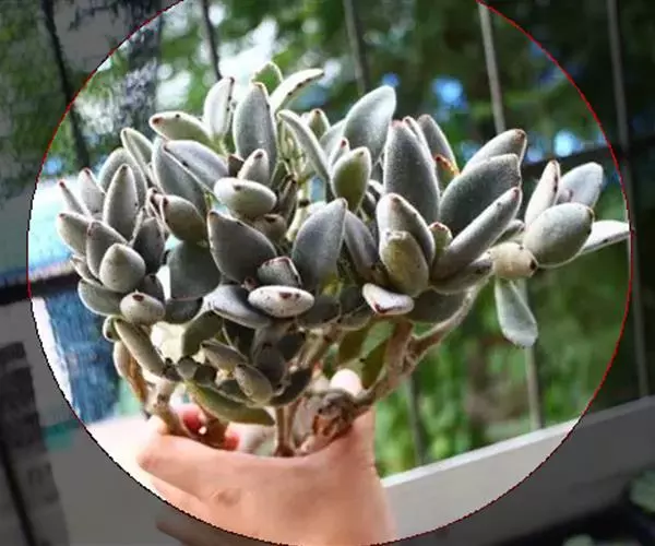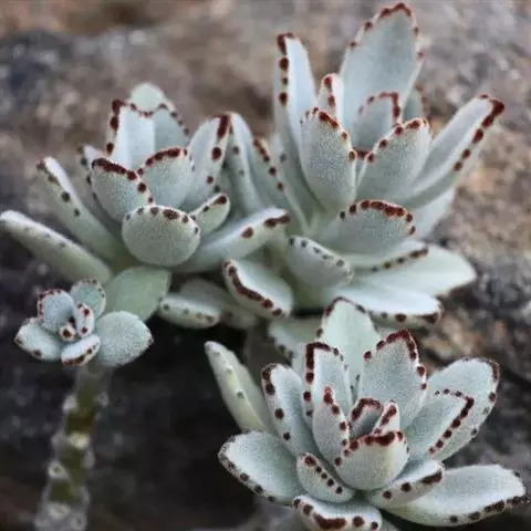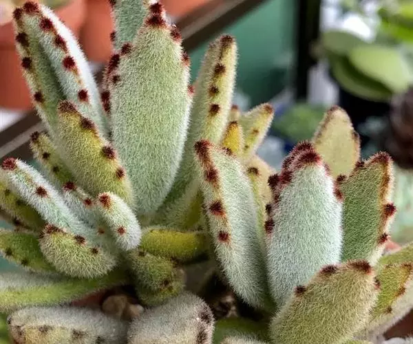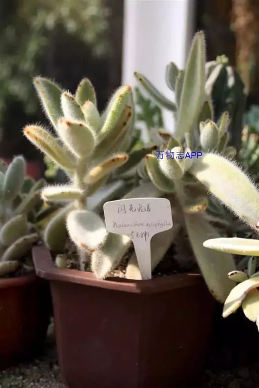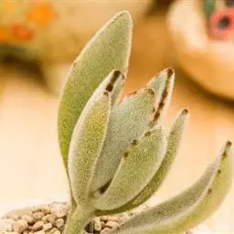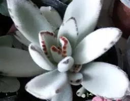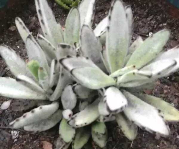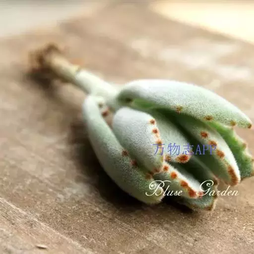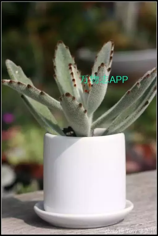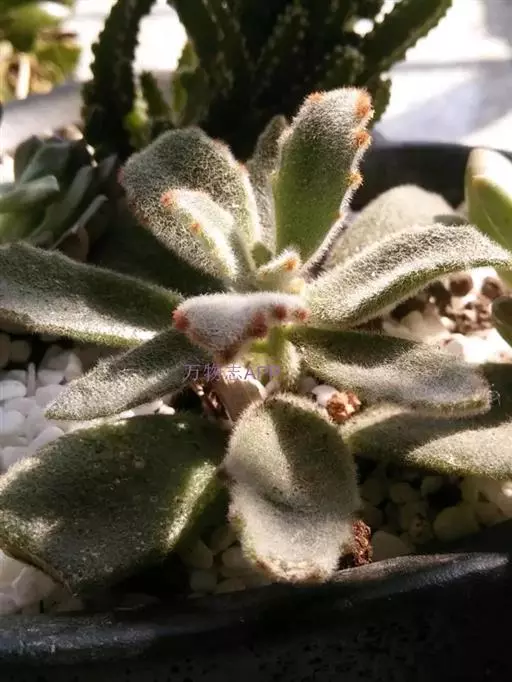 月兔耳(Kalanchoe tomentosa),正式中文名叫褐斑伽蓝,景天科伽蓝菜属,原产中美洲干燥地区及马达加斯加 。叶被绒毛,像兔子的耳朵,灰白色,间有褐色斑点,易分支,属于多肉植物中的冬型种,晚秋到早春生长旺盛。喜阳光充足的环境,阳光充足时叶尖会出现褐色斑纹。夏季要适当遮荫,不能过于荫蔽,否则会出现徒长。