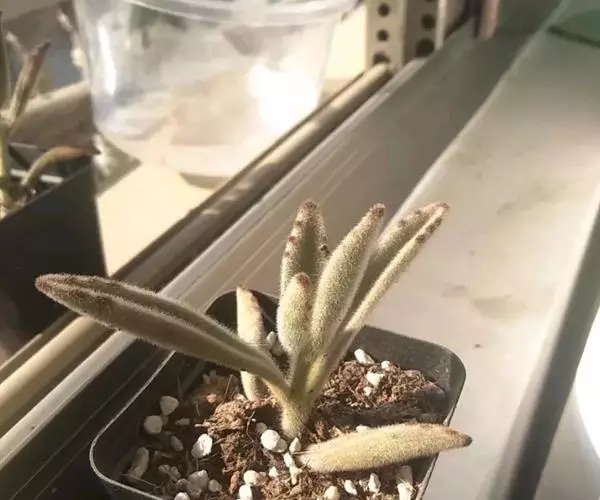 月兔耳就是养在全日照的阳光房里。生长期需保持土壤微湿,避免积水。土壤就用煤渣混合泥炭、少量珍珠岩,比例大概6:3:1。月兔耳在盆土干燥的情况下能耐零下2℃左右的低温,是室内的温度,非露天。整个冬季基本断水,5度以下就要开始慢慢断水了。