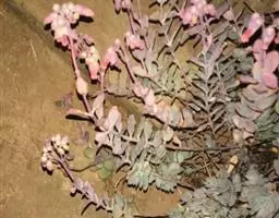 褐斑伽蓝为多年生多肉类植物,叶片奇特,形似兔耳,植株密被绒毛,叶片边缘着生褐色斑纹,植株为直立的肉质灌木,容易长高,中型品种。植株叶片对生,长梭型,整个叶片及茎干密布凌乱绒毛,新叶金黄色,老叶片颜色微微黄褐色,叶尖圆型,植株的叶片非常可爱,月兔耳和黑兔耳的区别是月兔耳的叶片边缘不容易发黑,黑兔耳的叶片边缘容易发黑。初夏开花,聚伞花序,花序较高,小花管状向上,花开白粉色,花瓣4片,花期较长。
