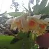 总状花序出自落了叶的老茎上端,具1-4朵花;花序柄长2-3毫米,基部被2-3枚膜质鞘;花苞片浅白色,膜质,宽卵形,长4-9毫米,先端钝;花开展,具香气,萼片和花瓣银白色或奶黄色;花梗连同子房与萼片同色,长约2厘米;中萼片长圆形,长2.7-3厘米,宽约8毫米,先端钝,具5条主脉和多数支脉;侧萼片斜卵状披针形,与中萼片等大,先端近锐尖,基部稍歪斜,具7条主脉和许多支脉;萼囊圆锥形,长约7毫米。