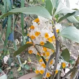 尖刀唇石斛(学名:Dendrobium heterocarpum Lindl.):茎常斜立,厚肉质,基部收狭,向上增粗,多少呈棒状,不分枝,具数节,节多少肿大。叶革质,长圆状披针形。总状花序出自落了叶的老茎上端,具1-4朵花;花开展,具香气,萼片和花瓣银白色或奶黄色;花瓣卵状长圆形,长2.5-2.8厘米,宽9-10毫米,先端锐尖,边缘全缘,具5条主脉和多数支脉;唇瓣卵状披针形,与萼片近等长,不明显3裂。花期3-4月。