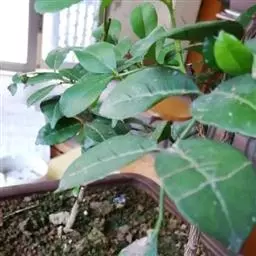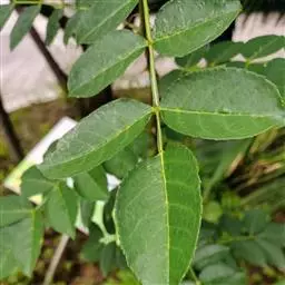 叶有小叶11-21片,稀较少;小叶通常对生或偶有不整齐对生,斜卵形,斜长方形或呈镰刀状,有时倒卵形,幼苗小叶多为阔卵形,长2.5-7厘米,宽1-3厘米,顶部短尖或钝,两侧甚不对称,全缘,或中部以上有疏裂齿,鲜叶的油点肉眼可见,也有油点不显的,叶轴腹面有狭窄、绿色的叶质边缘,常呈狭翼状。