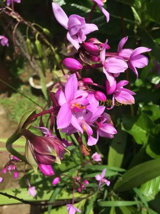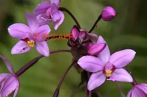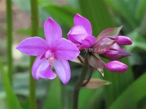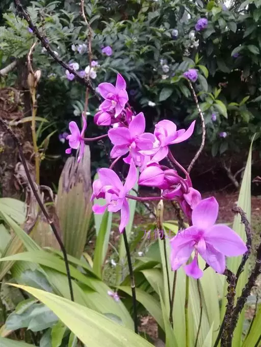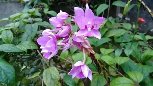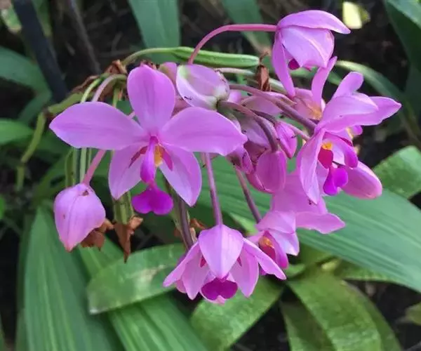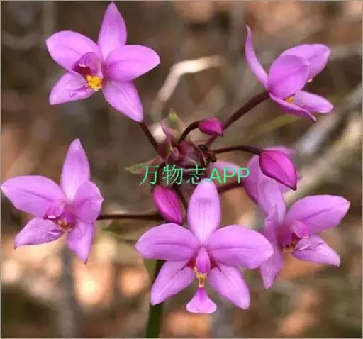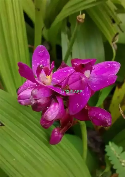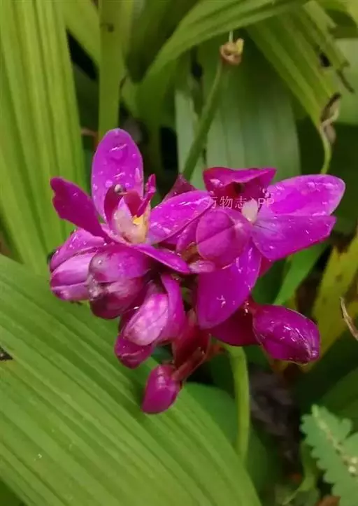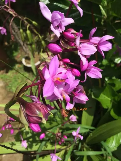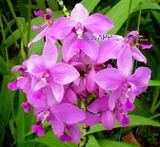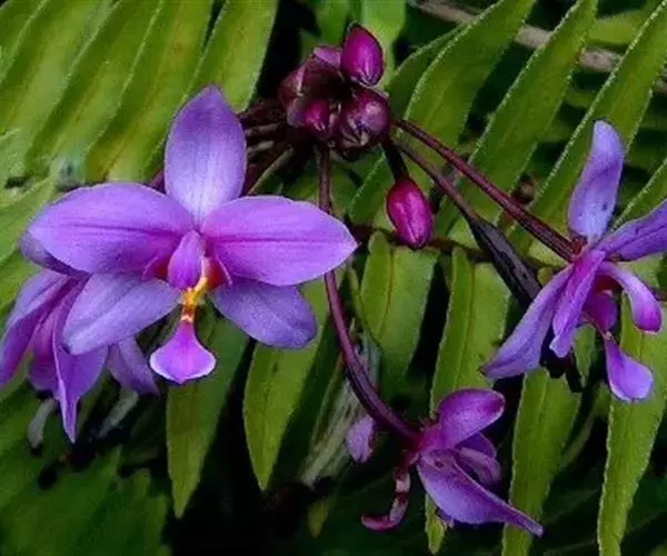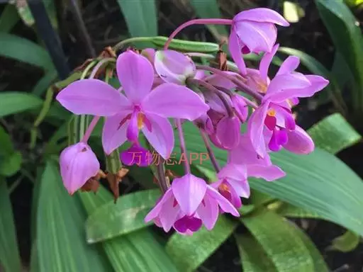 紫花苞舌兰(学名:Spathoglottis plicata Bl.):植株高达1米。假鳞茎卵状圆锥形,具3-5枚叶。叶质地薄,淡绿色,狭长,具折扇状的脉。花葶长达1米,下部具数枚筒状鞘;总状花序短,具约10朵花;花紫色;花瓣近椭圆形,比萼片大,先端锐尖;唇瓣贴生于蕊柱基部,长约1.5厘米,3裂。花期常在夏季。