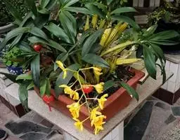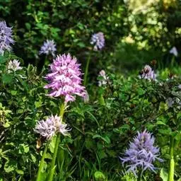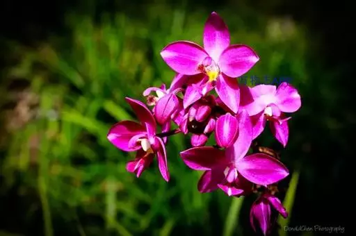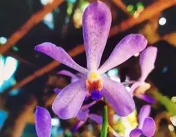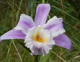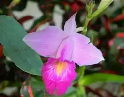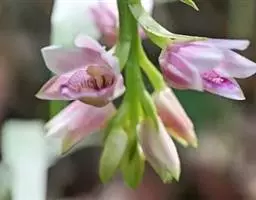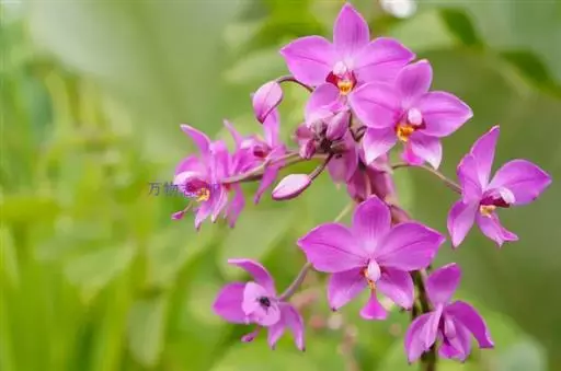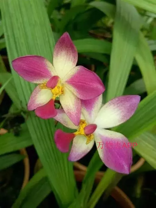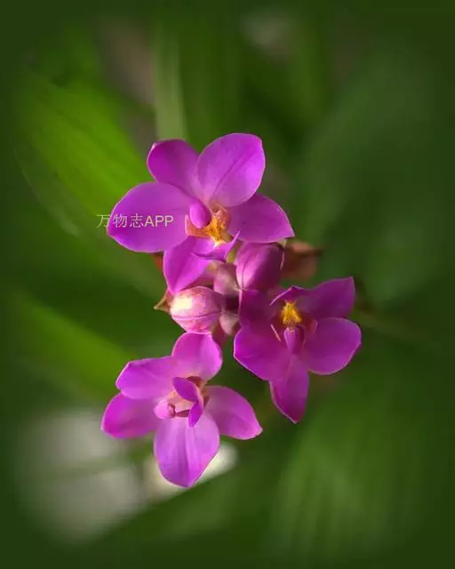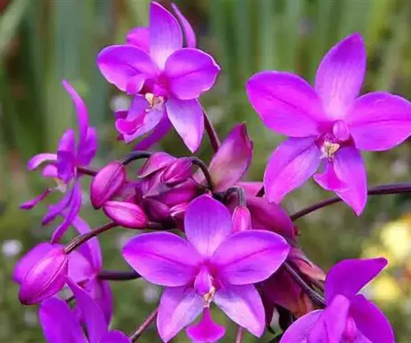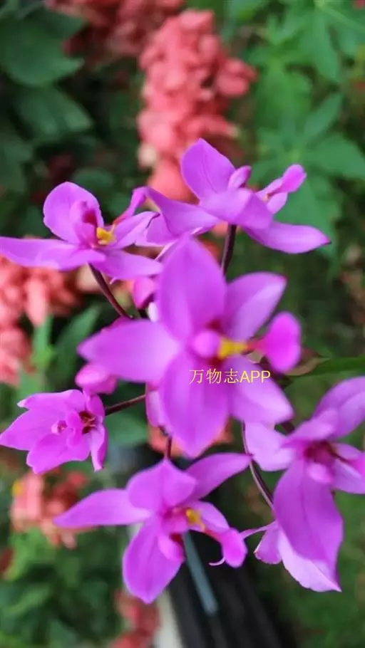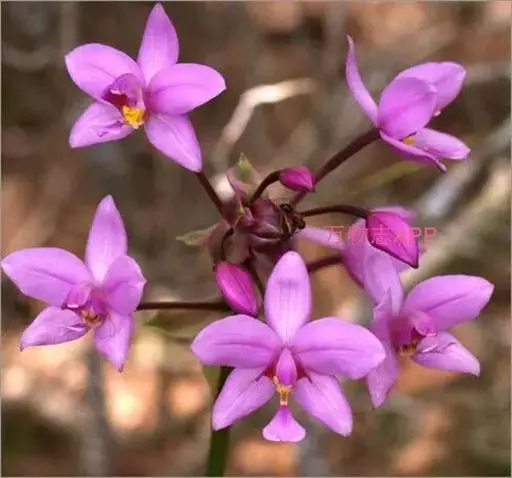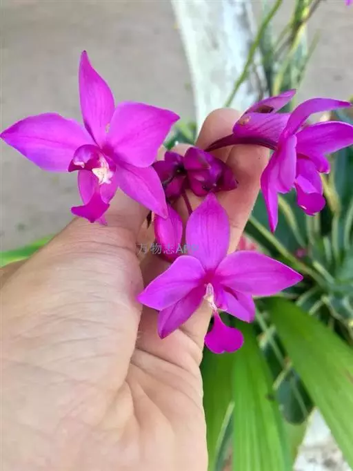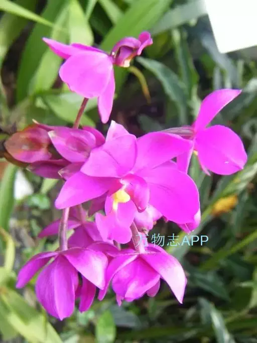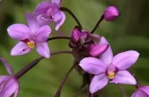 紫花苞舌兰(学名:Spathoglottis plicata Bl.):植株高达1米。假鳞茎卵状圆锥形,具3-5枚叶。叶质地薄,淡绿色,狭长,具折扇状的脉。花葶长达1米,下部具数枚筒状鞘;总状花序短,具约10朵花;花紫色;花瓣近椭圆形,比萼片大,先端锐尖;唇瓣贴生于蕊柱基部,长约1.5厘米,3裂。花期常在夏季。