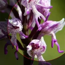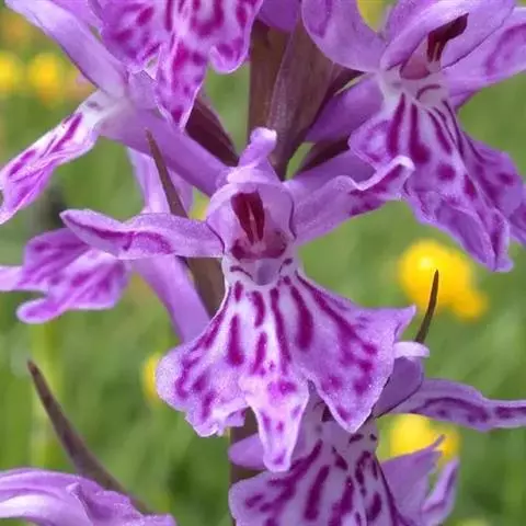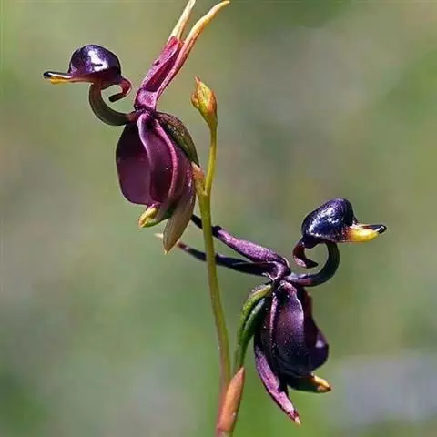 花葶长达1米,下部具数枚筒状鞘;总状花序短,具约10朵花;花苞片紫色,卵形,长约2厘米,向下反卷;花梗和子房紫色,比花苞片长;花紫色;中萼片卵形,凹陷,长1.5-1.7厘米,宽9毫米,先端锐尖;侧萼片斜卵形,与中萼片等大。