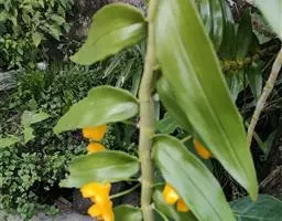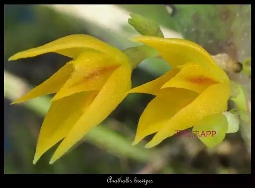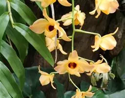 翅梗石斛(学名:Dendrobium trigonopus Rchb. f.):茎丛生,肉质状粗厚,呈纺锤形或有时棒状,不分枝,具3-5节,干后金黄色。叶厚革质,3-4枚近顶生,长圆形。总状花序出自具叶的茎中部或近顶端,常具2朵花,花下垂,不甚开展,质地厚,除唇盘稍带浅绿色外,均为蜡黄色;花瓣卵状长圆形,长约2.5厘米,宽1.1厘米,先端急尖,具8条脉;唇瓣直立,与蕊柱近平行,长2.5厘米,基部具短爪,3裂。花期3-4月。