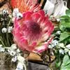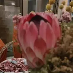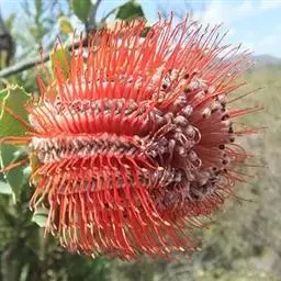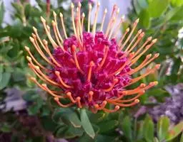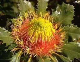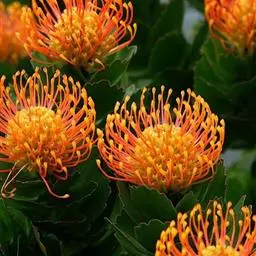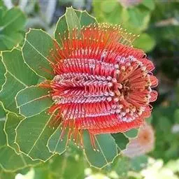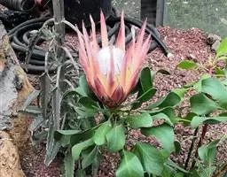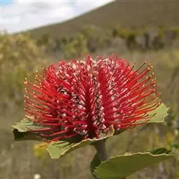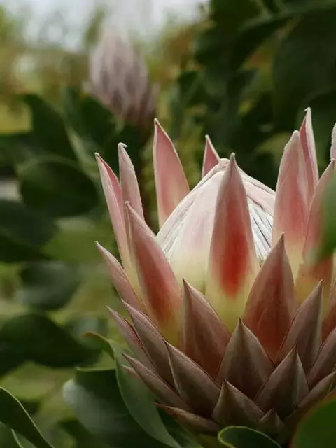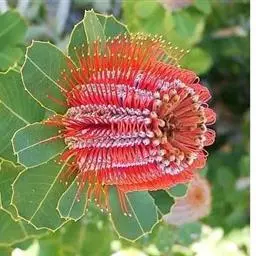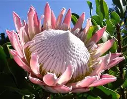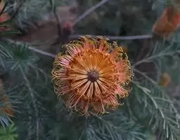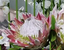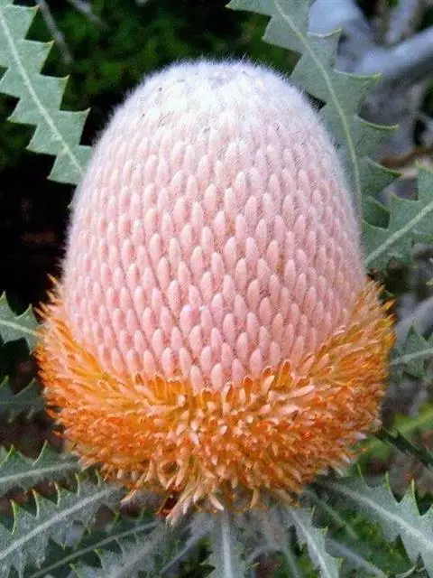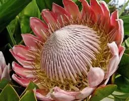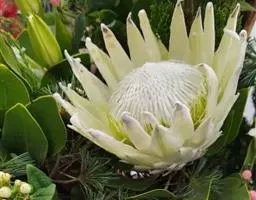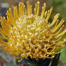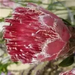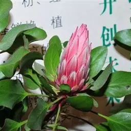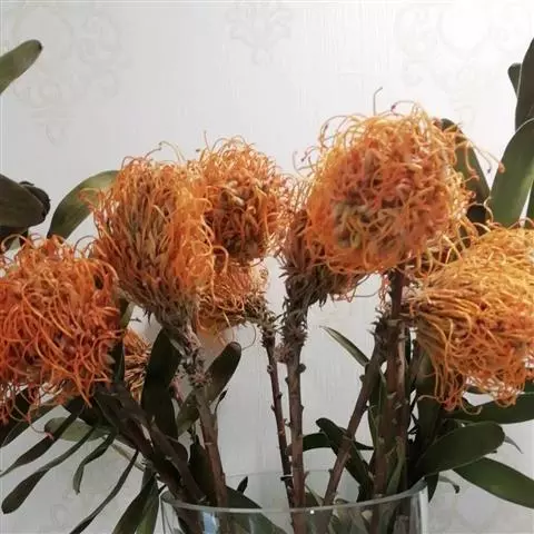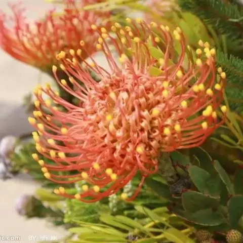 帝王花,山龙眼科帝王花属多年生常绿灌木植;茎干粗壮,叶色翠绿光亮;花朵呈圆球状;其苞片有的完全打开,…