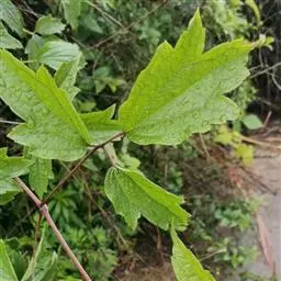 当年生枝基部及叶腋有宿存的芽鳞,鳞片披针形,长5-7毫米,宽2-3毫米,顶端有尖头,表面密被白色柔毛,以后无毛,内面无毛。三出复叶至二回三出复叶;小叶片3-9枚,窄卵状披针形至卵状椭圆形,长3-7厘米,宽1.5-3厘米,顶端钝尖,基部楔形至近于圆形,常全缘,上部边缘有粗牙齿,侧生的小叶常偏斜,主脉上微被柔毛,其余无毛;小叶柄短;叶柄长3-6厘米,被稀疏曲柔毛。