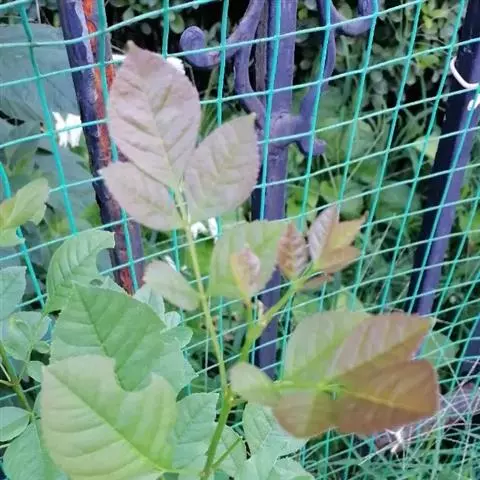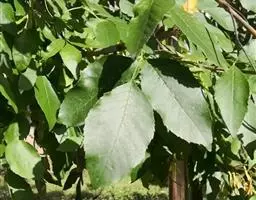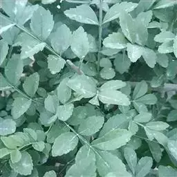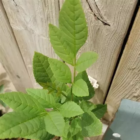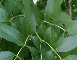 羽状复叶长15-25厘米;叶柄长4-6厘米,基部不增厚;叶轴挺直,上面具浅沟,初时疏被柔毛,旋即秃净;小叶5-7枚,硬纸质,卵形、倒卵状长圆形至披针形,长3-10厘米,宽2-4厘米,顶生小叶与侧生小叶近等大或稍大,先端锐尖至渐尖,基部钝圆或楔形,叶缘具整齐锯齿,上面无毛,下面无毛或有时沿中脉两侧被白色长柔毛,中脉在上面平坦,侧脉8-10对,下面凸起,细脉在两面凸起,明显网结;小叶柄长3-5毫米。