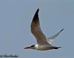 红嘴巨鸥,大型水鸟,体长47~55厘米。夏羽前额、头顶、枕和冠羽黑色。后颈、尾上覆羽和尾白色,…