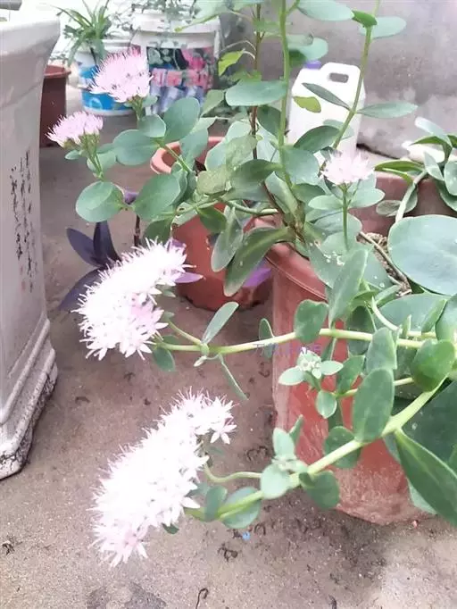 花序大形,伞房状,顶生,直径7-11厘米;花密生,直径约1厘米,萼片5,线状披针形至宽披针形,长1毫米,渐尖;花瓣5,淡紫红色至紫红色,披针形至宽披针形,长4-5毫米,雄蕊10,长6-8毫米,花药紫色;鳞片5,长方形,长1-1.2毫米,先端有微缺;心皮5,狭椭圆形,长4.2毫米,花柱长1.2毫米在内。