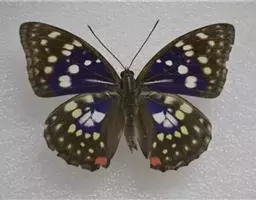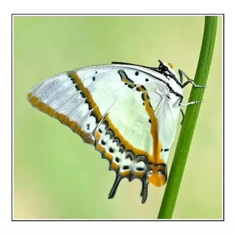 大二尾蛱蝶两翅正面黑色,中域有一浅绿色大型宽带纹,两翅反面浅绿色,中域有一缀黑边的褐色弧纹,…