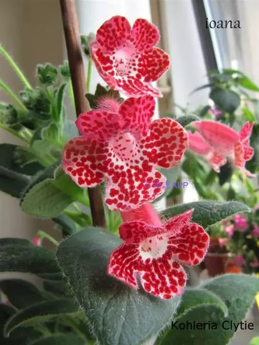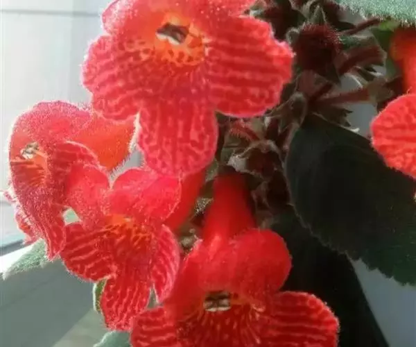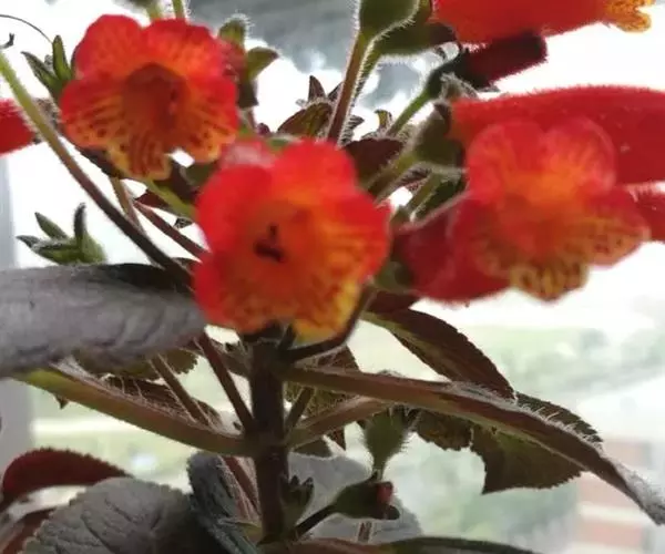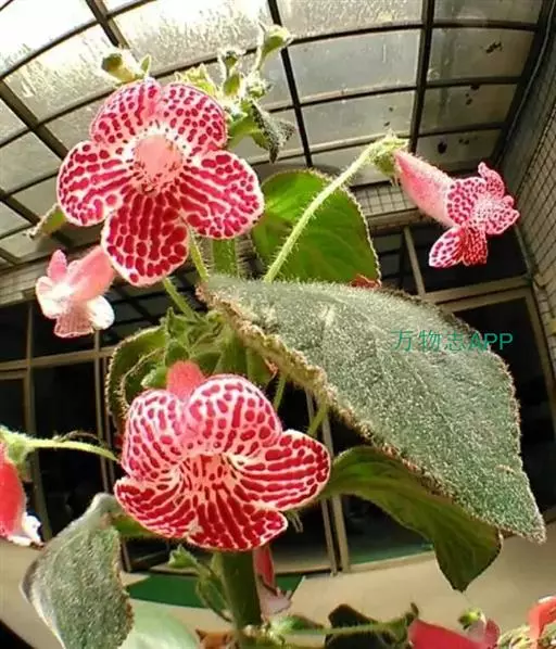 艳斑苦苣苔(Kohleria),别名花猫(Kohleriahybrida)也称“花脸”,是苦苣苔科花脸苣苔属的多年生草本植物,又名角桐草。花朵由无数的点、线及多种色块集合而成的艳斑苣苔,有着独树一格的艳丽气质,使得艳斑苦苣苔成为苦苣苔家族中最亮眼的一属。原产于中南美洲,属于苦苣苔科多年生草本植物。株高约10-50公分,全株布满细毛。叶色浅绿至深绿或紫红,部份品种叶上有斑纹,叶长椭圆形,边缘有细锯齿。花腋出,花冠筒状,花径约1-3公分,花瓣上有斑点及放射性的线条,花色有绿、红、粉红、橘等,花期为春至秋季。根部具毛虫状鳞茎,故其根茎常被网友称为“毛毛虫”,于原生地冬季休眠时地上部会萎凋,以鳞茎越冬,待春天天气转暖会再度萌发新芽;但在南方,很多品种于冬季时并不会休眠,只是开花数减少。其生性强健,花色艳丽,花期很长,病虫害少,管理容易,深得花友喜爱。
