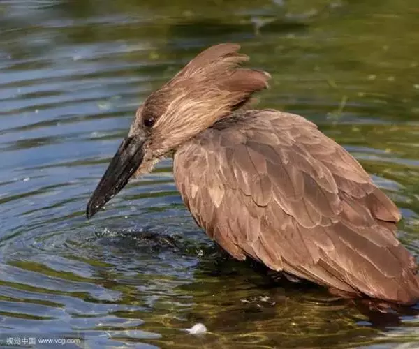 外形:锤头鹳体型较小,全长仅50厘米,体形咋一看像中型的鹭,但头、颈较短,前三趾间有微蹼。身体羽毛颜色也不漂亮,全体为褐色。雌雄同色,幼鸟也似成鸟。雏鸟多为污白色。锤头鹳奇异的外型特征是头部向后的长冠羽与嘴呈一直线使头部呈锤型,因而得名。嘴和脚黑色,虹彩褐色。