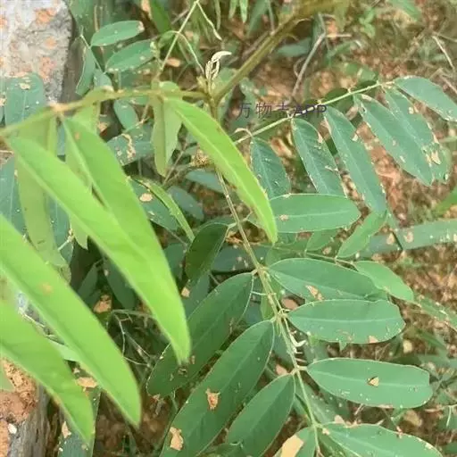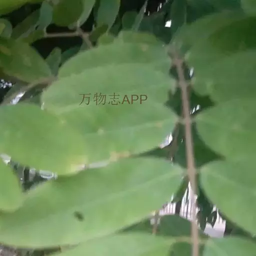 叶长20-30厘米;叶轴与叶柄无腺体,被微柔毛;小叶对生,6-10对,革质,长圆形或长圆状椭圆形,长3-6.5厘米,宽1.5-2.5厘米,顶端圆钝,常微凹,有短尖头,基部圆形,上面光滑无毛,下面粉白色,边全缘;小叶柄长2-3毫米;托叶线形,早落。