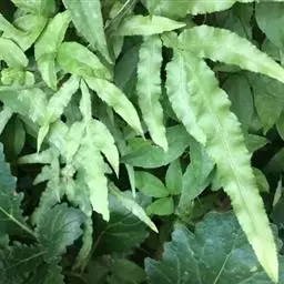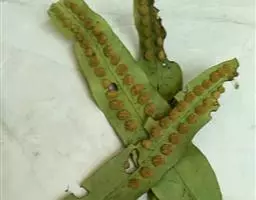 叶远生;柄长10-15厘米,粗约1毫米,浅棕色,上面有浅纵沟,光滑;叶片三角状卵形,长16-25厘米,宽14-18厘米,先端渐尖,基部为四回羽裂,中部为三回羽裂,向顶部为二回羽裂;羽片10-15对,互生,基部一对近对生,斜向上,彼此接近,基部一对最大,长8. 5-11厘米,宽4-8厘米,长三角形,渐尖头,基部不对称,柄长3-5毫米,三回深羽裂;一回小羽片约10对,互生,上先出,有短柄(长2-3毫米),羽轴上侧的略较短,基部一片与羽轴平行或覆盖羽轴,基部下侧一片最大,长4-5. 5厘米,宽2-2. 5厘米,椭圆形或长卵形,先端短渐尖,斜展,二回羽裂;二回小羽片5-7对,互生,上先出,上侧的有时略短,下侧的长8-15毫米,宽5-6毫米,椭圆形,钝头,基部为不对称的楔形,下延,深羽裂;裂片全缘,先端尖或有小缺刻;从第二对羽片起为椭圆披针形,羽轴基部上侧一片为深羽裂,其余的下侧为全缘,上侧有2-3个裂片。叶脉不甚明显,侧脉单一或分叉,几达叶边。叶革质,干后上面浅褐色,下面棕色,无毛。孢子囊群生于裂片上侧小脉顶端,每裂片1-3枚;囊群盖宽杯形,高稍过于宽,两侧边大部着生叶面,棕色,有光泽。