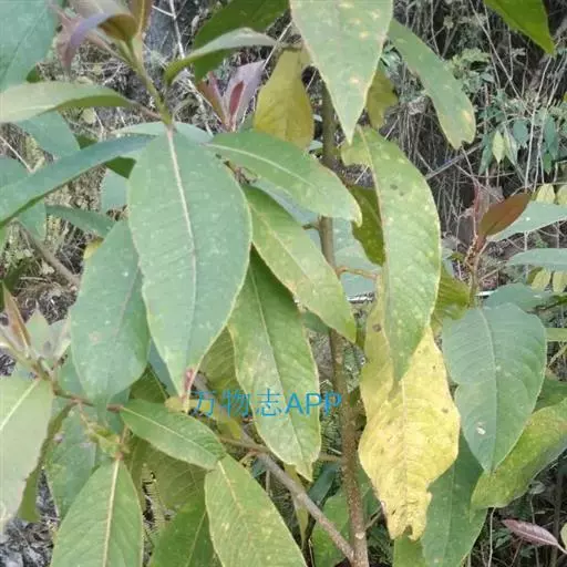 叶大型,薄革质,椭圆形或卵状长圆形或长圆状倒卵形,长13-40厘米,宽6-14厘米,先端锐尖或渐尖,基部钝或近圆形,边缘有钝齿,上面深绿色,脉上有疏毛,下面淡绿色,密生短柔毛,中脉在上面稍凹,在下面突起,羽脉 10-26对;叶柄长3-6厘米,上面扁平,下面圆形,有柔毛。
