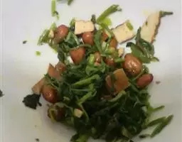 08.锅内热油,将沥干水份的梅干菜,放入炒香,加入少量白糖、生抽调味。(要尝尝味道不要太咸了);