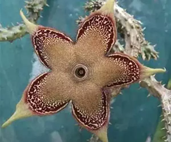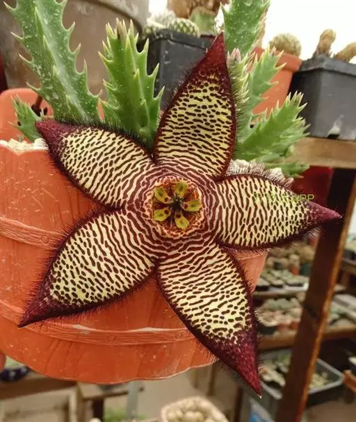 豹皮花又叫犀角,是一种多年生肉质草本植物,是较为理想的室内观赏花卉,豹皮花花期夏秋但不定时,花基生,单生或3朵至4朵并生,花径6厘米至7厘米。花瓣呈五角星状,黄色花瓣,花瓣上有棕色横纹,顶部有一个微型五角星。整个花朵光彩夺目,别具一格,是一种观赏价值很高的花卉。